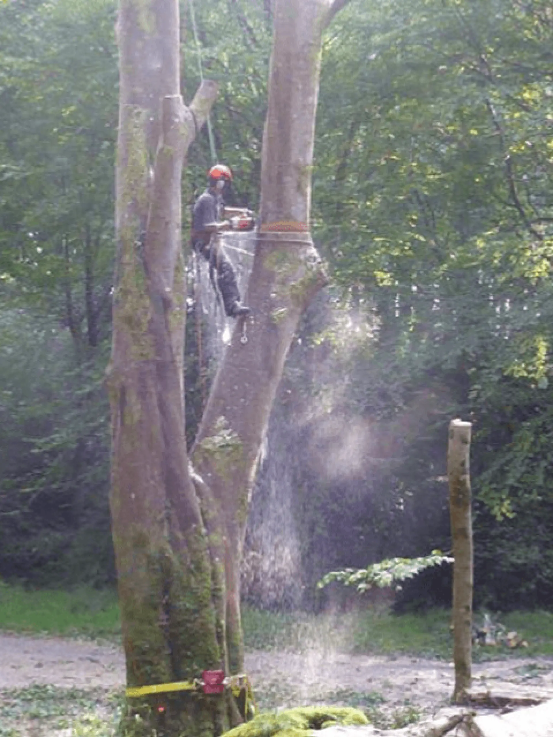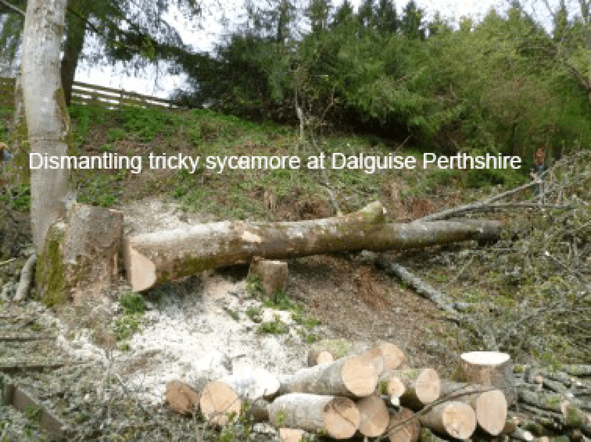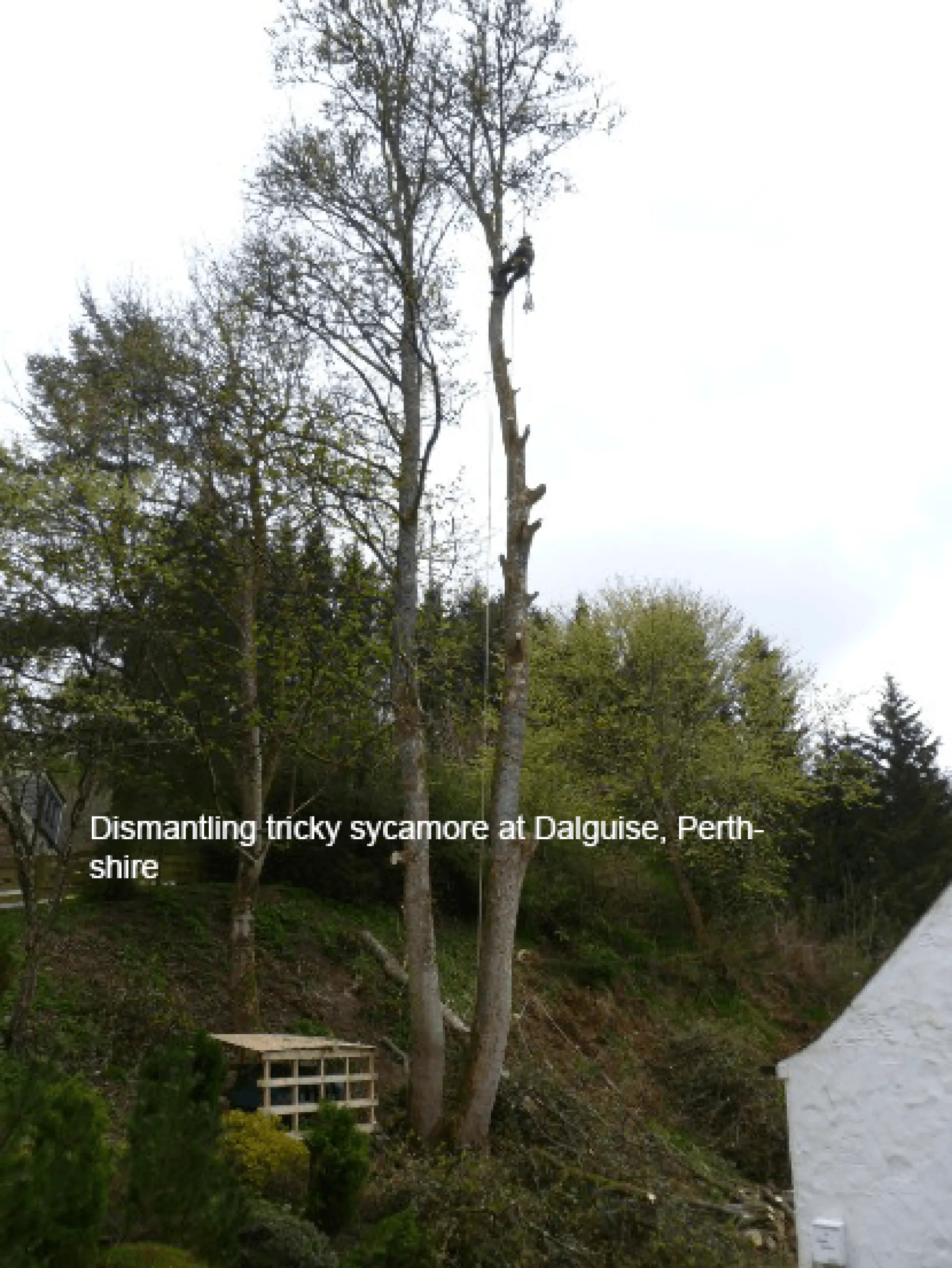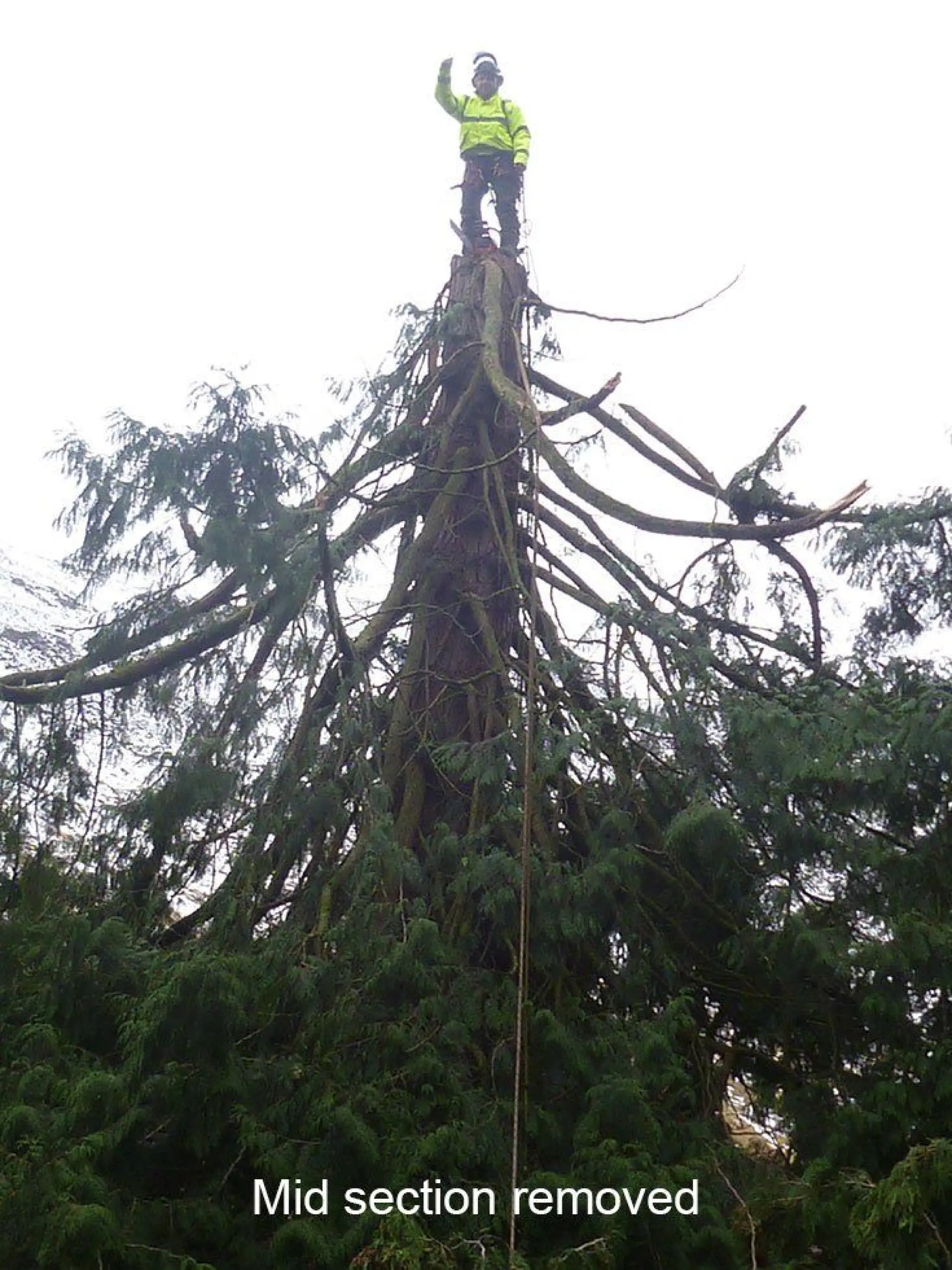 The images below are of a mature European Larch. It was twin stemmed with a compression fork, this included bark and a stress fracture from union to the base of the tree. Due to a risk of failure Glenisla Tree Climbers had to remove it for safety. From left to right is this removal in stages.