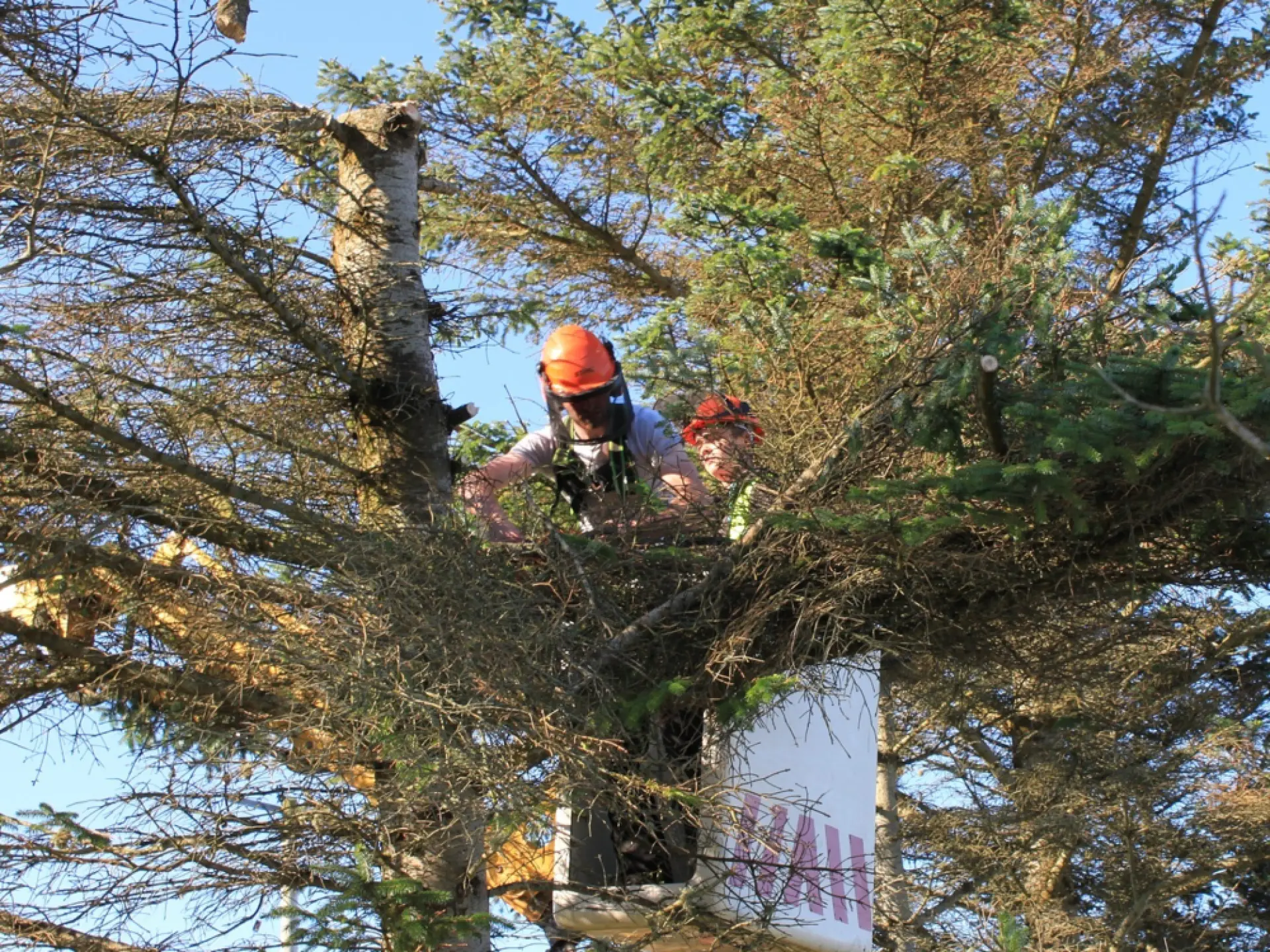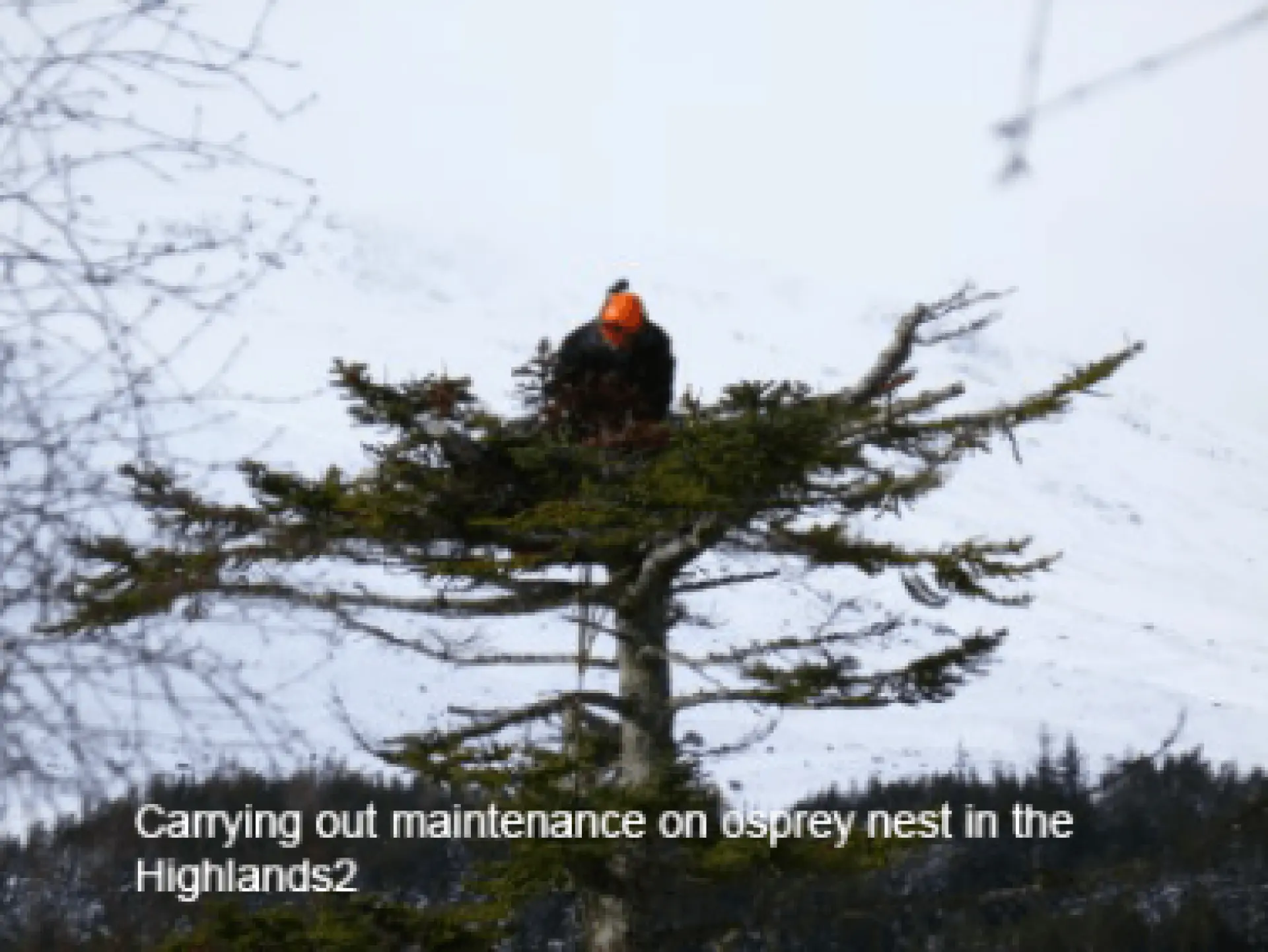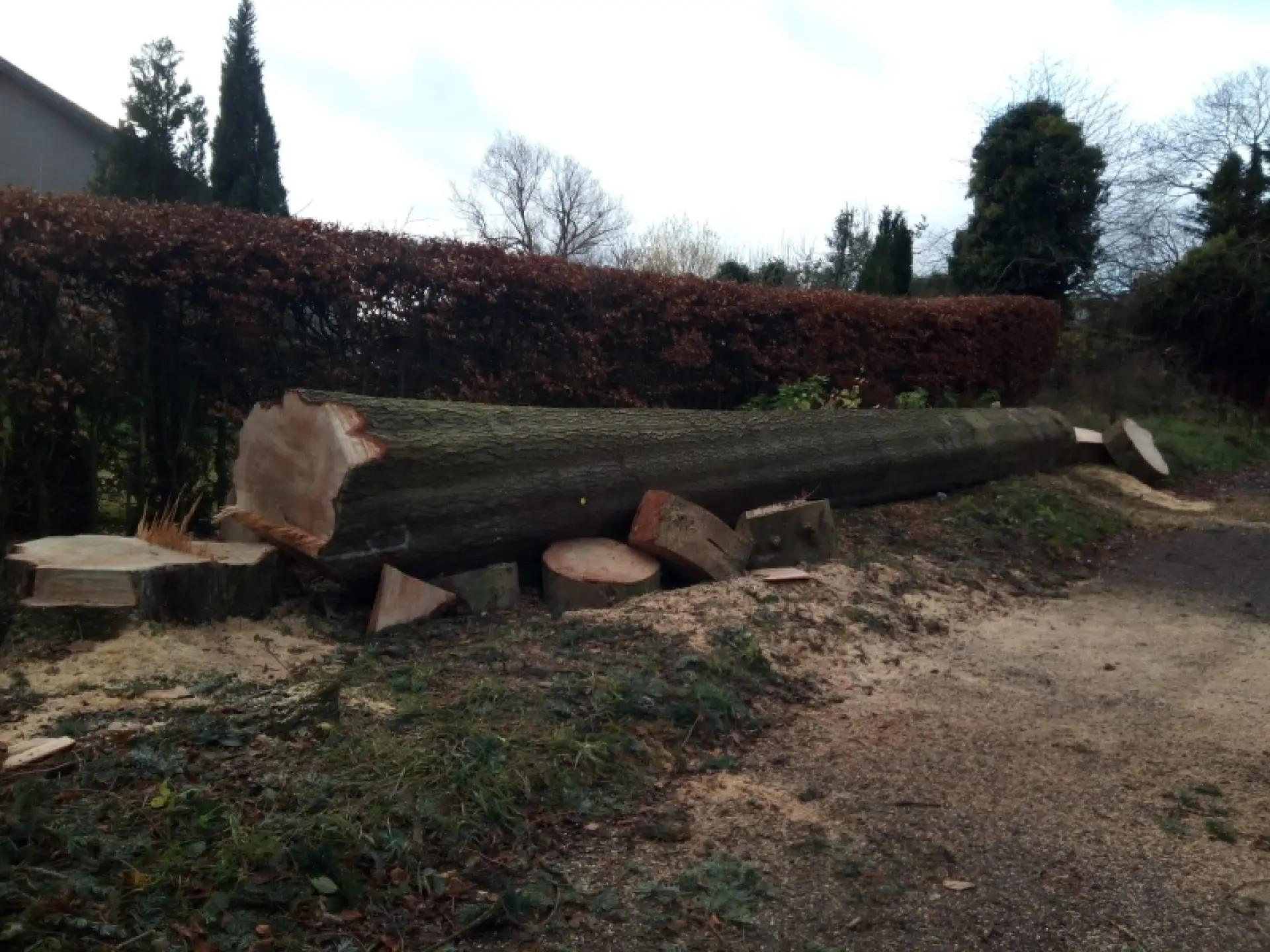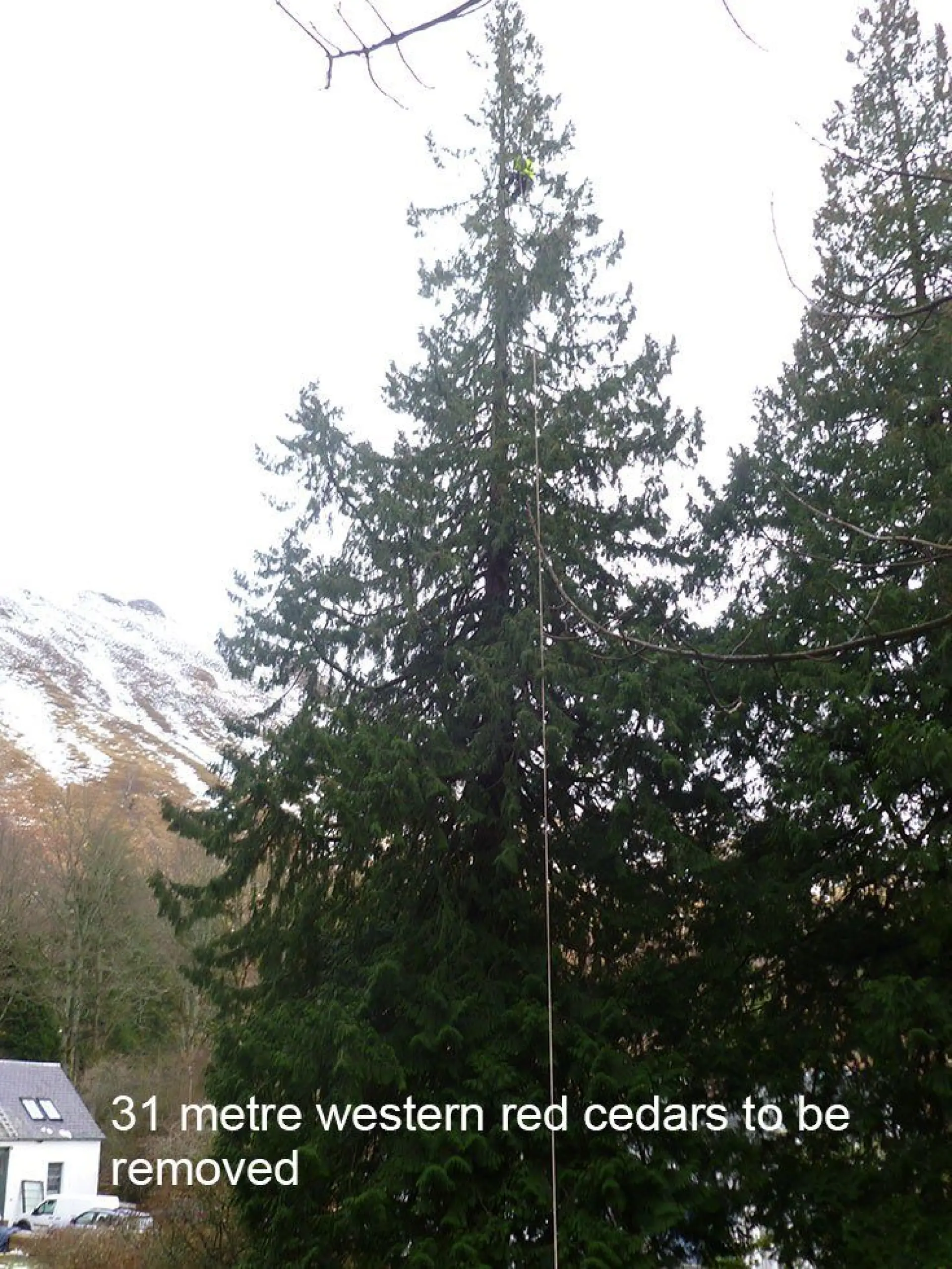 The images below are of a mature European Larch. It was twin stemmed with a compression fork, this included bark and a stress fracture from union to the base of the tree. Due to a risk of failure Glenisla Tree Climbers had to remove it for safety. From left to right is this removal in stages.